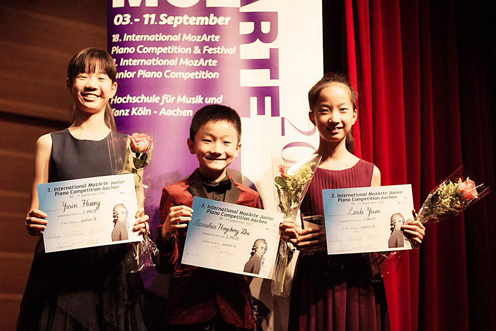 Beim International Piano Competition & Festival MozArte 2022 vom 3. bis 11. September in Aachen haben gleich drei Schüler aus der Klasse Uwe Balser Preise gewonnen:Der 9-jährige Maximilian Hongcheng Zhu erhielt den 2. Preis in der Kategorie Junior A (6-9 Jahre).In der Kategorie Junior B (11-13 Jahre) gab es einen Doppelsieg: