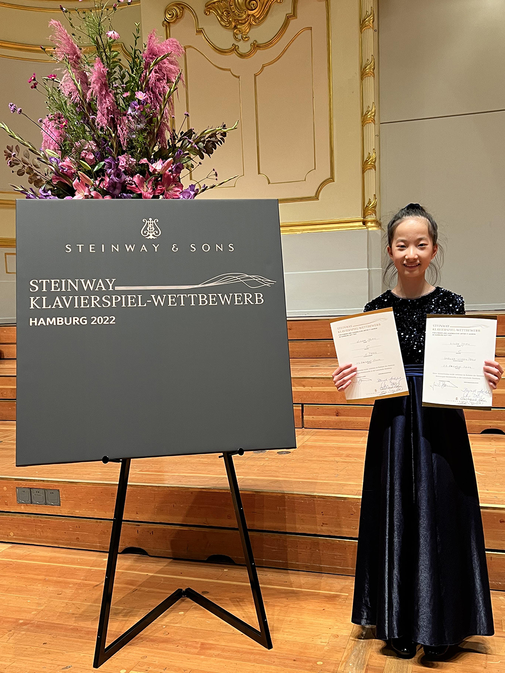 Die 12-jährige Linda Yuan aus der Klasse von Uwe Balser hat am Wochenende beim Steinway-Klavierwettbewerb in Hamburg in der Altergruppe C (11-13 Jahre) den 1. Preis, den altersgruppenübergreifenden "Wiener-Klassik" Sonderpreis und eine Förderung von der Oscar&Vera-Ritter Stiftung erhalten.